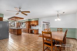 Steps lead into a substantial kitchen designed for serious home cooking, featuring expansive countertops, abundant cabinetry, and a central island suited for prep, serving, or conversation. An adjacent dining area provides enough room for a full table setup, keeping everyone connected while meals come together.
