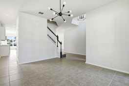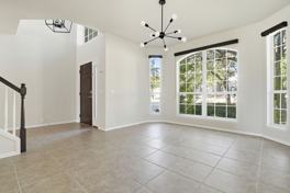 Inside, the home features an open, light-filled layout. The kitchen offers Corian countertops, a tile backsplash, plenty of counter space, a breakfast bar, recessed lighting, and newer stainless-steel appliances. Elegant lighting, updated hardware, and modern window shades enhance the home throughout.