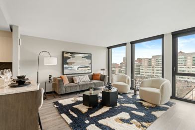 A rooftop sundeck allows residents to enjoy unobstructed views in all directions. Other amenities include a business center, gym, bike storage & package delivery service.