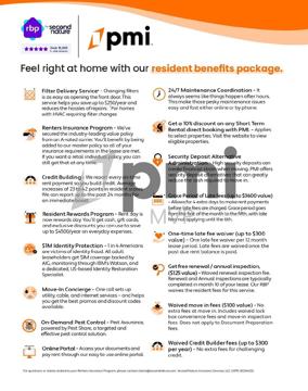 At Pmi, we strive to provide an experience that is cost-effective and convenient. That’s why we provide a Resident Benefits Package (rbp) to address common headaches for our residents. Our program handles insurance, pest control, air filter changes, utility set up, credit building, resident rewards, identity protection and more at a rate of $69.99/month, added to every property as a required program. More details upon application.
