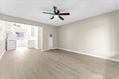 Fresh new floors flow throughout, complemented by ceiling fans for breezy comfort and wall heat for cozy evenings. A convenient hallway storage closet sits just outside the bathroom, making organization easy. Both bedrooms are generously sized and offer built-in closets with upper storage cabinets, giving you all the space you need without sacrificing style.