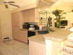 Spacious Open Floor Plan: 3 bedroom, 2 ½ bath 2 car garage with Pool completely enclosed with screening. Kitchen has all updated appliances with breakfast nook eating area. Living room has Tommy Bahama Style Florida Furnishings, flat screen T. V. There is a formal Dining Room with Rectangular Glass table & 6 Chairs. There are desks with computer equipment on an all modern L-Shaped Desk. Master Bedroom Suite is super large with King Size bed, round table & 2 chairs – all rattan style furniture. Guest Bedroom 1 has Queen Size Bed and Guest Bedroom 2 has a day bed with trundle style bed as well as additional sofa bed. Guest Bath has tub/shower combo: Master bath has deep garden style tub, separate walk in shower with L-Shaped double sink vanity: All Ceramic tile in the living room, dining room, kitchen and both bathrooms. Carpets in all 3 bedrooms. Pool Deck is covered so you can still sit outside when raining, then can sit and lounge in the sun on the pool deck. Lounging Chairs and sunning chairs on pool deck included.