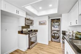 Westside complex—one of the area’s most desirable neighborhoods—this charming home sits across from the beautiful 105-acre Ralph Clark Regional Park, surrounded by lush, mature trees and a peaceful atmosphere. This quiet and well-maintained community offers a relaxing ambiance with beautifully kept grounds cared for by the Association. This desirable end-unit features a comfortable two-story layout with no one above or below. The home offers two generous primary bedrooms, each with its own bathroom. The interior is enhanced by beautiful brand-new vinyl flooring throughout. The stunning remodeled kitchen features black granite countertops, upgraded white shaker cabinets, tray ceiling, and brand-new stainless steel/black appliances, including a 5-burner gas range and dishwasher. A convenient casual dining area, a cozy living room, a downstairs half-bathroom, and handy inside laundry with brand-new washer and dryer (included in the sale) add to the home’s appeal. One of the primary bedrooms offers a vaulted ceiling and mirrored closet doors. One of the bathrooms upstairs has been completely remodeled with a modern walk-in shower. Additional upgrades include fresh interior paint, recessed lighting, ceiling fans, blinds, and crown molding. Numerous windows fill the home with natural light, creating a bright and airy atmosphere. Central air conditioning and heating ensure year-round comfort. Just steps away are two detached carports plus plenty of guest parking. A large sliding door leads to an extra-large, fully fenced front patio—perfect for pets, gardening, barbecues, or enjoying your morning coffee. Enjoy the community amenities, including a pool, spa, and playgrounds, cover water, trash. Conveniently located near shopping, restaurants, grocery markets, parks, and golf courses. The house is empty. The furnitures are for display purposes.