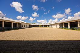 Exquisite Equestrian Estate Minutes from WEF. Nestled in a peaceful enclave and inspired by a custom designed Ralph Lauren farm, this newly constructed equestrian facility is designed for the discerning professional. With up to 40 stalls and two elegant living options-- gorgeous three-bedroom staff quarters and a pro residence --this property offers both sophistication and functionality. The courtyard-style barn features permanent stalls with filtered waterer in stalls and paddocks, 14′ ceilings, two air-conditioned tack rooms, 11 wash stalls, and rubber flooring. GGT courtyard arena and a large Equitan outdoor ring, Horsegym treadmill, and 10 beautiful grass paddocks--all set amid tranquil surroundings, ideal for preparation and recovery. Fans in stalls, fly spray system equipped.