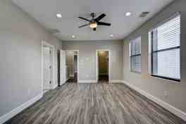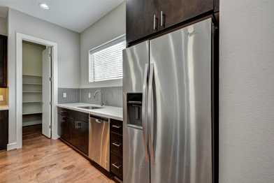 The beautiful 3-bed, 3.5-bath home is located in Houston! Upon entering the house, you are greeted by hardwood flooring that transitions to vinyl in the downstairs bedroom. This bedroom can also be used as an office if you WFH. Upstairs is the primary bedroom, which has multiple windows for natural sunlight. This bedroom also includes a walk-in closet. The bathroom features a full-sized tub, double vanity sinks, and a standing shower. The kitchen features a large kitchen island and stainless steel appliances. The living area, where the balcony is located, is spacious enough to accommodate a few chairs and a table. This home also has a small gated side yard!
