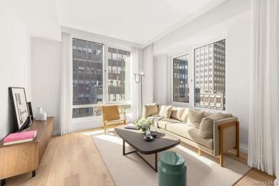 BRAND NEW UNIT, NEVER LIVED IN. Welcome to Residence 9G at Monogram New York, a thoughtfully designed 1-bedroom, 1-bathroom home with a separate home office, spanning 713 square feet and boasting 10-foot ceilings. South-facing floor-to-ceiling windows fill the space with abundant natural light, framing sweeping Midtown views and enhancing the residence's modern tranquility. The home features wide light-oak flooring and insulated glass in-swing casement windows, blending comfort with contemporary craftsmanship. An efficient, open layout maximizes livability and furniture versatility, while smart-home thermostats, Bosch washer & dryer, and oversized closets add everyday convenience. The custom-designed kitchen by Neri&Hu offers a serene and sophisticated atmosphere defined by honed Calacatta Monet marble countertops and backsplashes, Kallista faucets, and fluted natural light oak cabinetry. Upper cabinets finished in dark bronze and reeded glass add depth and texture, complemented by a hidden pantry with a built-in bar and appliance drawer. The space is completed by premium Gaggenau and Bosch appliances, creating the perfect balance between luxury and functionality. The marbled bathroom exudes refined opulence with full-height fluted Bianco Carrara marble walls, custom dark bronze vanities with white Carrara tops, and wall-mounted Kallista fixtures. Underfloor heating and recessed bronze shelving add warmth and utility, while reeded glass shower dividers enhance privacy within the spa-like environment. Residents enjoy access to an exclusive suite of amenities promoting wellness and community, including spa-inspired private wellness areas and The Crest Club, a rooftop sanctuary with panoramic terraces, a reading lounge with fireplace, bar, and private dining suite. Lifestyle concierge services by LIVunLtd offer personalized assistance with travel, dining, event planning, and more, ensuring effortless luxury in every detail.