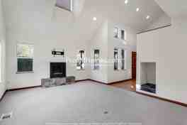 -Expansive living area featuring vaulted ceilings, plush carpet, multiple picture windows for ample natural light, and a modern gas fireplace