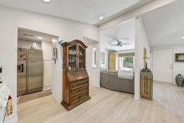 Welcome to Desert Groves, a gated 55+ community offering resort-style amenities and a relaxed lifestyle. This well-maintained 2-bedroom, 2-bath double-wide home features an open-concept great room with vaulted ceilings, a cozy den with fireplace, and a split floor plan for added privacy. The spacious primary suite includes a jetted tub and separate stall shower. Enjoy a private, gated carport, a one-car garage, and additional community parking for guests. Lease is fully furnished per seller's inventory. Community amenities include two pools, a clubhouse, and RV parking—perfect for your desert getaway!