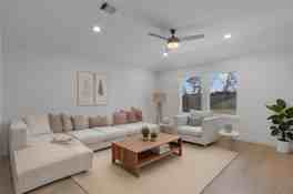 Beautiful ranch-style home featuring a charming farmhouse design with brick accents and a grand entry with high ceilings. Open-concept layout with wood-look flooring, a spacious family room filled with natural light, and a gourmet kitchen with tall shaker cabinets, Whirlpool stainless steel appliances, a large island, granite countertops, tile backsplash, and a walk-in pantry. The private primary suite offers high ceilings, plush carpet, dual sinks, cultured marble counters, a frameless glass shower, and a large walk-in closet. Additional features include two guest bedrooms, Energy STAR efficiency, a tankless water heater, and a Smart Home System to control locks, lighting, thermostat, and security remotely. Dont miss out on this home!
