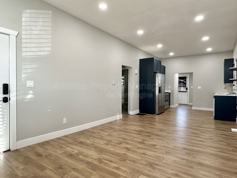 The main level has an open family room and kitchen with Lvp flooring throughout the living areas. The kitchen features stainless steel appliances, navy cabinets, and updated fixtures. Both bedrooms are located off the main living space. The primary bedroom includes an attached three-quarter bath, and the second full bathroom sits just off the kitchen on the way to the backyard for easy access.