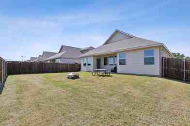 and linen closets on one end and the primary suite overlooking the backyard and covered patio on the other. The