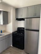 Remodeled kitchen with stylish gray shaker cabinets, stainless-steel sink, gas range, and refrigerator
