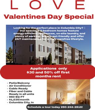 Valentine’s Day Special at Simonson Estates $30 Application Fees • 50% Off First Month’s Rent Simonson Estates in Columbia City offers spacious and comfortable two‑bedroom apartment homes with features designed to make everyday living easier. Residents enjoy access to large floor plans with substantial closet space and private balconies. The community provides on‑site laundry facilities, ample off‑street parking, responsive maintenance services, and energy‑efficient appliances in every home, with select units offering private outdoor spaces. Every apartment is cable‑ready and equipped for high‑speed fiber connections, ensuring reliable work‑from‑home and streaming capability. Simonson Estates is also a pet‑friendly community that welcomes both cats and dogs, with a two‑pet limit per residence. The location provides convenient access to Columbia City amenities, including Morsches Park, Whitley County Family YMCA, Chapman's Brewing Company, and the Blue River Trail. Now is a great time to apply and secure reduced move‑in costs while availability lasts. Learn more or apply at: www simonsonestatesapts com