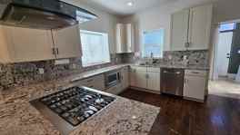 Upstairs offers the primary suite with vaulted ceilings, exposed brick, two walk-in closets, and its own private bathroom. Two additional bedrooms and a second full bath sit across a wide landing and a private balcony.