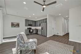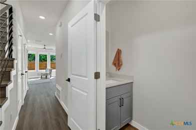 Welcome to this modern and thoughtfully designed 3-bedroom, 2.5-bath townhome! The open-concept living area over looks the fenced in backyard and is perfect for entertaining! This townhome features high ceilings, an abundance of natural light, and sleek hardwood floors throughout. The kitchen is complete with granite countertops, a deep, farmhouse sink, and stainless steel appliances. This townhome also has a one-car garage and driveway parking. The spacious primary suite offers a luxurious ensuite bathroom, complete with double vanity sinks, a shower/tub combo, and granite counters. Each bedroom and living area is equipped with a ceiling fan, and the home features an inviting office nook upstairs, providing the ideal space for work or study. This gated townhome community also offers additional covered parking for guests and is conveniently located near Tobias Elementary School. With easy access to I-35, downtown Kyle, shopping, dining, and entertainment, you’ll enjoy the perfect blend of convenience and comfort.