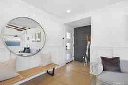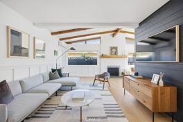 Step into a peaceful private courtyard where a gas fire pit glows beneath soft café lights. It’s an inviting setting that feels perfect for relaxed evenings and quiet moments under the stars. Inside, the home opens to a bright living room with vaulted ceilings and exposed wood beams. A wood-burning fireplace with a floating walnut mantel adds warmth and charm, while a built-in alcove creates an ideal space for working from home or focusing on creative projects. The living area flows naturally into a beautifully remodeled kitchen featuring white quartz counters with waterfall edges, modern lighting, and a custom breakfast nook. Just beyond the kitchen, you’ll find a barista-inspired coffee area complete with a wine fridge and a spacious pantry that keeps everything neatly organized. The primary bedroom includes well-designed closets and an updated bathroom with dual sinks. Each of the additional bedrooms offers comfort and flexibility for guests, work, or everyday living—and all three are equipped with their own mini-split systems for personalized climate control. Throughout the home, you’ll find thoughtful updates including new windows, engineered hardwood flooring, fresh interior paint, a new roof, and an upgraded electrical system with a new panel. Large sliding doors lead to a fully redesigned backyard that supports effortless indoor-outdoor living. Enjoy a wide turf lawn, modern pavers, and a dedicated play area with decomposed granite suited for a variety of activities.
