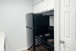 This cozy kitchen features a sleek, black appliance package—including a spacious refrigerator and an electric stove with coil burners—perfect for everyday cooking. Freshly painted light walls and crisp white upper cabinets create a bright, airy feel and offer plenty of storage.