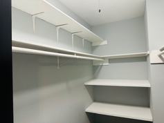 This inviting bedroom features beautiful wood-style flooring and soft, neutral wall tones that create a calm and modern atmosphere. A ceiling fan with built-in lighting provides year-round comfort. The room includes a generously sized walk-in closet with built-in shelving—perfect for organized storage.
