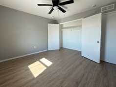 This inviting bedroom features beautiful wood-style flooring and soft, neutral wall tones that create a calm and modern atmosphere. A ceiling fan with built-in lighting provides year-round comfort. The room includes a generously sized walk-in closet with built-in shelving—perfect for organized storage.
