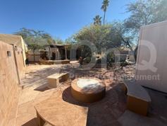 This charming 3-bedroom, 2-bathroom single-level home offers 1,401 square feet of comfortable living space in the desirable Fountain Park community. The galley-style kitchen features solid wood cabinets, tiled countertops, and a matching backsplash. The cozy living area includes a fireplace and a light-filled atrium that brings the outdoors inside. The primary bedroom offers a walk-in closet and an updated ensuite shower, while the additional bedrooms are well-sized and share a full hall bath. A bonus 98-square-foot Arizona room overlooks the beautifully landscaped, low-maintenance backyard, complete with an extended flagstone patio, raised planter beds, a shady mesquite tree, and a hot tub with slider access from the primary bedroom. The home includes a two-car garage with additional storage space. Community amenities include a pool, park, playground, and scenic walking paths—all within a peaceful, established neighborhood conveniently located near shopping, dining, and schools.