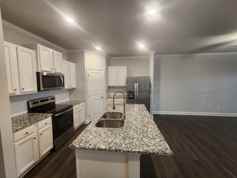 - A welcoming open-concept kitchen with granite counters, white cabinetry, and stainless steel appliances, including an electric stove, microwave, refrigerator, and dishwasher, perfect for effortless daily cooking