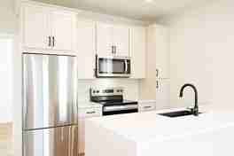 This 600 sqft apartment sits above an oversized one-car garage and offers an open-concept living room that connects seamlessly to a modern kitchen with quartz countertops and stainless steel appliances. Large windows fill the space with natural light. The single bedroom includes a full en-suite bathroom and a closet with a stacked washer and dryer.