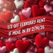 Valentine’s Special - Sweeten your move — get 1/2 off February rent when you move in by 02/14.