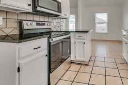 The kitchen includes ample cabinet storage, tile countertops, and an easy-to-clean tile floor. All bedrooms are nicely sized, and the bathrooms offer modern lighting and a double-sink vanity in the main suite. The home also includes a two-car garage and a fenced backyard.