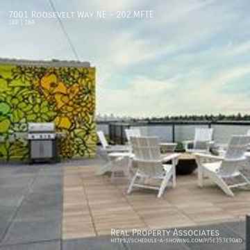 Our rooftop has fire tables, BBQs, Ping-Pong, pet relief area, and excellent views of downtown Seattle, Mount Rainier, and Green Lake.