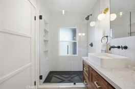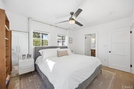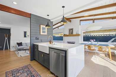 Step into a peaceful private courtyard where a gas fire pit glows beneath soft café lights. It’s an inviting setting that feels perfect for relaxed evenings and quiet moments under the stars. Inside, the home opens to a bright living room with vaulted ceilings and exposed wood beams. A wood-burning fireplace with a floating walnut mantel adds warmth and charm, while a built-in alcove creates an ideal space for working from home or focusing on creative projects. The living area flows naturally into a beautifully remodeled kitchen featuring white quartz counters with waterfall edges, modern lighting, and a custom breakfast nook. Just beyond the kitchen, you’ll find a barista-inspired coffee area complete with a wine fridge and a spacious pantry that keeps everything neatly organized. The primary bedroom includes well-designed closets and an updated bathroom with dual sinks. Each of the additional bedrooms offers comfort and flexibility for guests, work, or everyday living—and all three are equipped with their own mini-split systems for personalized climate control. Throughout the home, you’ll find thoughtful updates including new windows, engineered hardwood flooring, fresh interior paint, a new roof, and an upgraded electrical system with a new panel. Large sliding doors lead to a fully redesigned backyard that supports effortless indoor-outdoor living. Enjoy a wide turf lawn, modern pavers, and a dedicated play area with decomposed granite suited for a variety of activities. Additional convenience awaits in the garage, which features a built-in workshop and side-by-side laundry. This modern bohemian bungalow blends comfort and style, offering a beautifully updated space ready to be enjoyed.