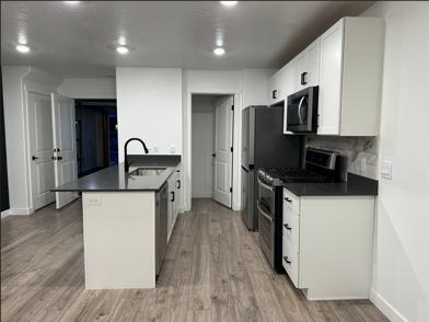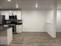 The kitchen features sleek stainless-steel appliances, elegant black countertops, and a variety of cabinets to keep everything organized. It is bright and well-lit, creating an inviting space for cooking and gathering. The living room, located just off the kitchen, offers a cozy layout with enough room to relax and enjoy your downtime.