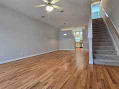 Discover contemporary comfort in this beautifully maintained condo, tucked inside a peaceful gated community. Ideally situated just minutes from Hobby Airport, this light-filled home features an open-concept design with the living, dining, and kitchen areas all located on the second floor—along with a full bathroom for added convenience. The kitchen comes equipped with stainless steel appliances and generous cabinet space. Soaring vaulted ceilings and expansive windows fill the home with natural light, accentuated by elegant hardwood flooring throughout. Upstairs on the third floor, the spacious primary suite includes a luxurious en-suite bathroom and an oversized walk-in closet with built-in drawers and shelving. A tandem garage provides parking for two vehicles.