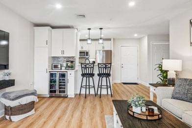 Experience coastal living at its finest in this stunningly renovated condo located directly on Revere Beach. This thoughtfully designed residence features a bright and modern kitchen equipped with white shaker cabinetry, tiled back splash, quartz counter tops, stainless steel appliances, and a breakfast bar perfect for casual dining and entertaining. The open-concept layout flows into a spacious living room adorned with custom built-in cabinetry and a stylish dry bar complete with a beverage/wine fridge. The unit offers a spacious bedroom with a custom closet and an updated bathroom showcasing a glass-enclosed tiled shower with a built-in bench and elegant tile flooring.