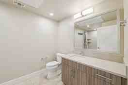 The spacious primary suite includes a large walk-in closet and a sleek bathroom with dual vanities and a glass-enclosed shower.