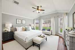 The chef’s kitchen features a gas cooktop for precise cooking and easy meal prep. Engineered wood flooring in the main living areas and primary suite adds warmth and durability, while ceramic tile in wet zones offers low-maintenance practicality. The split-bedroom floorplan ensures peace and privacy for all, and a generously sized laundry room keeps household tasks organized and efficient.