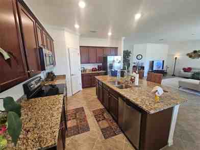 Why are you still in the snow?? Get out of the cold and come to sunny Florida for the Holidays with this HOLIDAY SPECIAL! Pet Friendly and 2 King beds. Can NOT beat this picture lake view! Voted one of top 55+ communities in the country. Beautiful Furnished 2 Gorgeous bedrooms + den, 2 Bathroom. 2 Car Garage. Kitchen has Granite Countertops, Large center island, Stainless steel appliances, Separate dining area. Carpeted bedrooms Large Master Bedroom with king bed. Master Bathroom includes dual sinks, roman shower & large walk in closet. Guest bedroom with king bed. Den has desk and French doors with futon. Enjoy the tranquil sounds and gorgeous lake and preserve views from the extended paver lanai with picture screen and pocket sliders from living room and extra patio dining furniture for entertaining or peaceful relaxation. Home is meticulously kept. Pelican Preserve offers community additional 70,000 sq ft. Town Center 2 outdoor pools, indoor lap pool & walking track, pickle ball, tennis, spa, fitness center, 2 restaurants, craft, sewing, woodworking room, billiards room, theater, exercise classes bingo nights, card rooms, outside amphitheater, nature walk with preserve boardwalk & more. Availability November Prorated $2400 per month plus taxes and fees, utilities included. December $4500 or April 2026 $5000 per month plus taxes and fees includes utilities. Rental includes electric w/cap, cable & internet, tenant to pay 11.5% tax. Go swimming instead of skiing!
