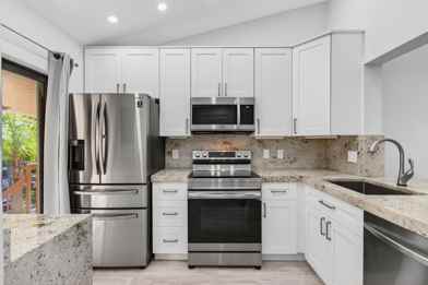 Beautifully Updated 3 Bed,2 Bath Condo in East Boca Raton. Discover this bright and spacious second-floor condo offering a modern open layout and move-in ready appeal. This remodeled home features a gourmet kitchen with granite countertops, shaker-style cabinetry,and plenty of prep space for the home chef. Both bathrooms are elegantly updated with matching granite counters for a cohesive,upscale design. Porcelain tile flooring throughout ensures durability and easy maintenance, while vaulted ceilings in the living area create a light and airy atmosphere. Enjoy your morning coffee or evening breeze from the screened-in balcony,complete with a convenient washer and dryer located in the balcony storage closet. Ideally situated in East Boca Raton--just minutes from FAU, pristine beaches and dining
