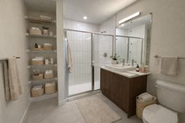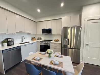 In this 1000-sq.-ft. 2 Bed & Flex unit, clean design and efficient planning come together to create an inviting environment. Open movement throughout the unit enhances comfort, making each space feel connected yet purposeful. Each unit includes a kitchen with full-size LG appliances, in-suite laundry, and independent heat pumps in each bedroom and living space. This unit also features elevated ceilings, enhancing openness and adding a touch of luxury. The result is a comfortable and polished unit that feels both functional and refined.