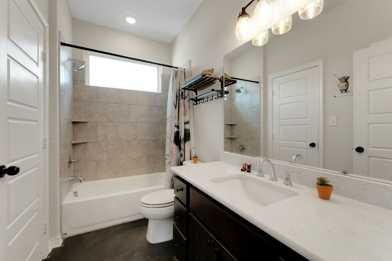 Welcome to your charming new construction ranch-style home nestled in Sunset Canyon! This thoughtfully designed single-story home offers serene hill country living, complete with an expansive front porch and deck—perfect for relaxing or entertaining—with a built-in pet gate for added convenience. Inside, the beautiful kitchen boasts sleek white countertops, a subway tile backsplash, stainless steel appliances, and a breakfast bar with eat-in dining space. The refrigerator is included, making move-in a breeze. The open-concept living area features easy-to-maintain stained concrete floors, while a convenient utility closet off the kitchen comes equipped with a washer and dryer. Enjoy privacy in the spacious primary suite, complete with an en-suite bath and walk-in closet. Two additional guest bedrooms feature ceiling fans and share a full bath between them. Step outside and unwind under the stars at your private fire pit—ideal for cool hill country nights.