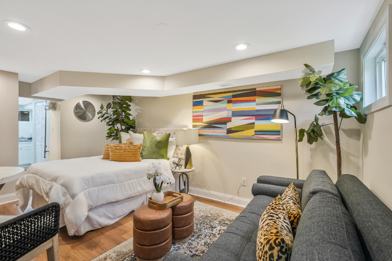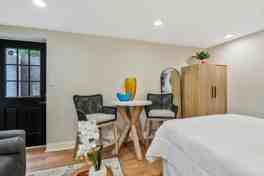 Enjoy a private entrance with a complete studio setup: furnished bedroom with a full-size bed, full bathroom, sofa bed, fully equipped kitchen (pots, pans, dishes, utensils), and in-unit washer/dryer. Just bring your clothes and personal items - everything else is ready for you.
