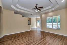 Lovely curb with the perfectly positioned palm tree leading to covered front porch with patio. Step through the glass door into inviting foyer with 2019 luxury vinyl plank flooring. To the left is spacious dining room to the right is the potential fourth bedroom or office. Leading straight ahead through the archway is an oversized living room with tray ceilings overlooking the custom paver and fenced backyard. For the ultimate privacy to the right of the home is a perfectly positioned primary bedroom featuring Tray ceiling and a sitting room. Sitting room as view of the backyard as well. Primary bath is Spa like with double vanity, garden, soaking tub and walk-in tile and glass door surround there are two closets in the primary. Leading back across the home you are greeted with a warm kitchen with 2019 stainless steel appliances, plenty of modern cabinets and a bar top island room for 4 to 5 barstools. There is a breakfast area as well overlooking oversized custom paver patio. Just behind the kitchen are two additional bedrooms and second bathroom perfectly positioned pool potential door leading to the backyard. A 4th bedroom could be easily added. The bathroom features handicap, grab bars and tile combo shower/tub. No carpet in this beautiful home only luxury vinyl plank and tile flooring. Stepping out of your double sliding glass door from the breakfast area you step outside onto a covered lanai perfect for watching the game on the TV! All electrical including outlets and fixtures 2019. 6 months part of maintenance program. Hot water 2023 and the hvac is a 2008 Trane which is best residential system maintained evry This property has fruit trees, oversize paver patio, and 6 foot vinyl fenced with double gate on the right hand side of the property for easy lawnmower, accessibility. There are 42 solar panels on the roof of the home. This home comes equipped with a solar panel system that offers consistent, predictable energy costs—no surprises as utility rates rise. All close to the beach!