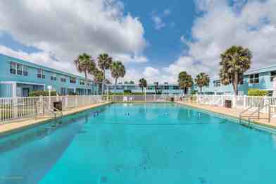 Whats not to love about this beautiful poolside 1 bedroom 1 bath condo. Very clean and Light and bright! Walk across the street to the beach! Hear the waves from your large porch. Full kitchen. Beautiful terrazzo floors. First floor unit, over looks pool, shuffleboard, community room and green space. Close to Space Force Base, shopping and restaurants. Pet free Community.