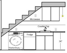 Under the stairs kitchenette with refrigerator, sink, induction stove, microwave, cabinets and dinning slab. (under construction)