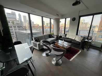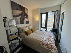 Walk into a foyer at the beginning of the hallway where you can also see the gorgeous welcome den/office. Followed by the main queen sized bed bedroom with ensuite 3-piece tub bathroom, large closet, TV and monitor equipped desk with a beautiful view of the lake and St. James Church. Followed by the main (guest) 3-piece stand-up shower bathroom of the unit which is across from the second queen sized bedroom with drawer chest, closet, TV, and monitor equipped desk. Then laundry room and living room featuring 100" projector screen ideal for popcorn movie night amidst the beautiful city light and balcony for a lake view.
