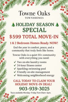 🏡 1 & 2 Bedroom Homes – Towne Oaks Townhomes (55+ Community) Available Now Experience peaceful, easy living in this well-kept 55+ community in Tyler. These cozy 1-2 bedroom townhomes offer comfort, convenience, and a welcoming atmosphere that residents love. ✨ Community Features: • Central air & heat • Hardwood floors • Dishwasher • Community pool • Two on-site laundry rooms • Access gates • Beautifully maintained grounds • Pet-friendly environment • Quiet, friendly neighbors Towne Oaks is close to shopping, dining, and medical services — making everyday life simple and stress-free. 📞 Call 903-939-3025 📧 **** Ask about availability and schedule your tour today!