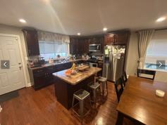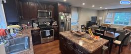 - A modern kitchen equipped with essential appliances including a washer, dryer, refrigerator, gas range, exhaust hood, dishwasher, and microwave