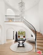 Set behind gates in one of Malibu's most coveted enclaves, this Spanish Mediterranean estate offers exceptional privacy, resort-style amenities, and beautifully updated interiors across a rare multi-structure compound. A gated motor court introduces the residence with a covered entry and stately wood double doors that open to a dramatic two-story foyer filled with natural light. The formal living and dining rooms create an elegant flow for entertaining, while the expansive chef's kitchen features marble counters, an ascending Wolf hood, six-burner Wolf range, double Wolf ovens, Sub-Zero refrigeration, Fisher & Paykel dishwashers, a large island with sink, breakfast bar seating, and an additional dining area overlooking the grounds. A jewel-box powder room leads toward the inviting family room, where wood floors, vaulted beamed ceilings, a grand fireplace, a reading nook, and French doors create a seamless connection to the outdoors. A staircase here descends to a temperature-controlled wine cellar. Two serene bedrooms anchor the main levelone with sliding doors and tranquil pool views, the other with wood floors, a built-in desk, and access to a stone-finished bathroom with dual showerheads. Upstairs, a versatile bedroom or bonus room connects to a Jack-and-Jill bathroom shared with an adjoining suite featuring beamed ceilings, a sliding barn door, and a custom walk-in closet. Another bedroom offers high ceilings, a loft accessed by spiral stairs, an en-suite bathroom, and a walk-in closet. The private primary suite enjoys vaulted ceilings, a sitting area with fireplace, balcony access, a spa-style bathroom with steam shower, freestanding tub, and a keypad-entry closet. Crowning the home is an octagonal tower room accessed by an exterior spiral stairway an atmospheric perch ideal for yoga, meditation, or quiet retreat. The backyard unfolds as a true resort with a large pool and automatic cover, in-ground spa, expansive brick terraces, a pergola-covered outdoor living and dining pavilion, a Lynx-equipped outdoor kitchen, and generous grassy lawns framed by fruit trees and mature privacy hedges. A dedicated outdoor gym area and a full tennis court with stadium lighting and batting setup elevate the property's recreation potential. Two exceptional guest houses each positioned above its own two-car garage offer complete self-sufficient living with wood floors, stone counters, KitchenAid appliances, dining space, light-filled living rooms opening to balconies, comfortable bedrooms, and stone-finished bathrooms. Nest systems, thoughtful upgrades, and manicured landscaping complete this private Grayfox retreat, offering a rare opportunity to enjoy true resort living in the heart of Malibu.