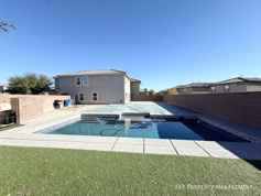 The functional layout features one bedroom conveniently located downstairs. The modern kitchen is equipped with granite countertops and an island with modern fixtures. Outside, the massive backyard oasis centers around a sparkling pool, perfect for relaxation and entertaining. The community also provides a playground, and the home includes a 2-car garage.