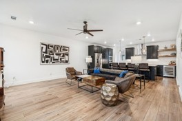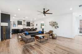 On the second floor, an open-concept living and dining area is filled with natural light and anchored by warm wood-look floors. The kitchen features quartz countertops, a large island with seating, gas cooktop including KitchenAid stainless steel appliances, custom cabinetry, and a built-in wine refrigerator. A powder bath serves this level for convenience. The second-floor primary suite offers a true retreat with a private balcony, a large walk-in, customizable, Elfa closet, dual vanities, and an oversized walk-in shower.