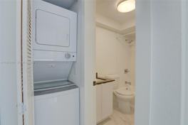 Kitchen equipped with granite countertops, stainless steel appliances, and ample cabinet space, central air conditioning, an IN-UNIT WASHER AND DRYER, impact-resistant windows and doors, and one assigned parking spot. Its convenient location provides easy access to shopping, dining, and the beach.